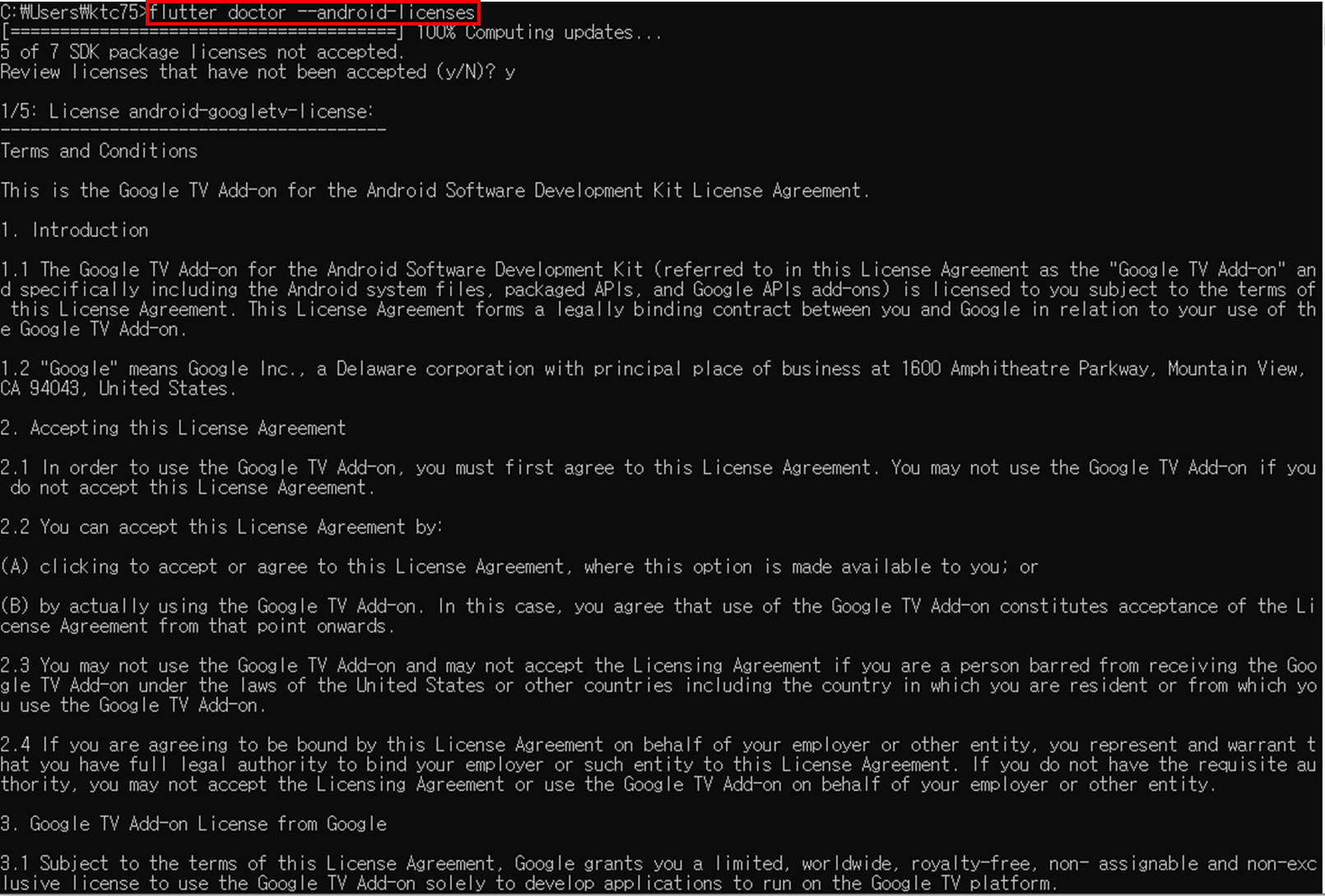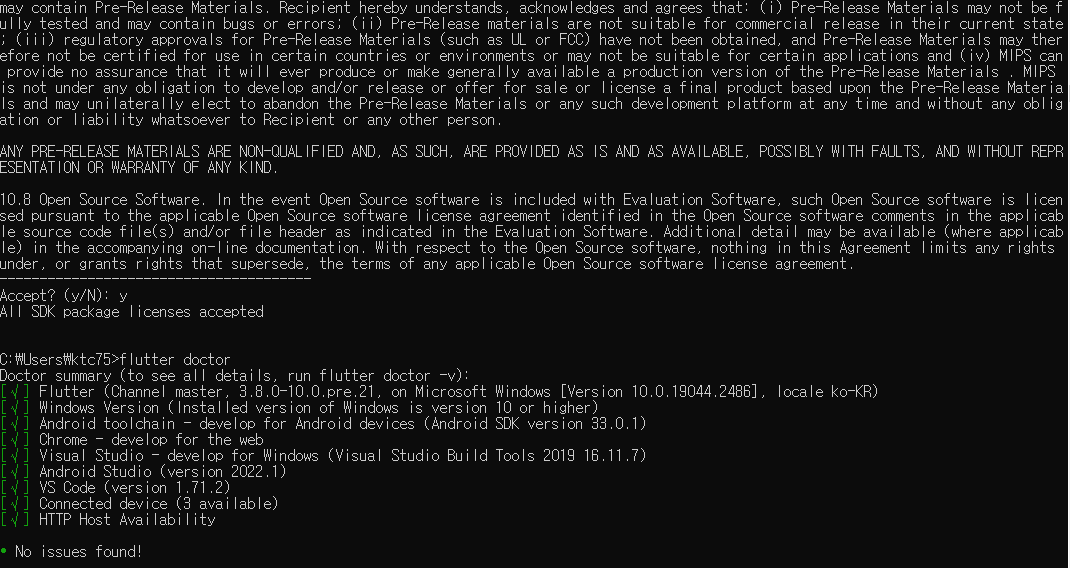 1. cmd 창에서 flutter doctor --android-licenses 입력 후 엔터